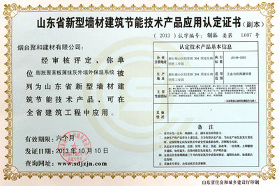 2013年(nián)10月(yuè)10日(rì),我公司生(shēng)産的(de)膨脹聚苯闆薄抹灰外(wài)牆外(wài)保溫系統被山(shān)東(dōng)省住房(f∞áng)和(hé)城(chéng)鄉(xiāng)建設廳列為(wèi)山(shān)東(dōng)省新型牆材建築節能(néng)技(jì)術(shù)産品,具備了(le)生(shēng)産外(wài)牆外(wài)保溫系統的(de)膠粘劑和(hé)抹面膠漿的(de)條件(jiàn)。